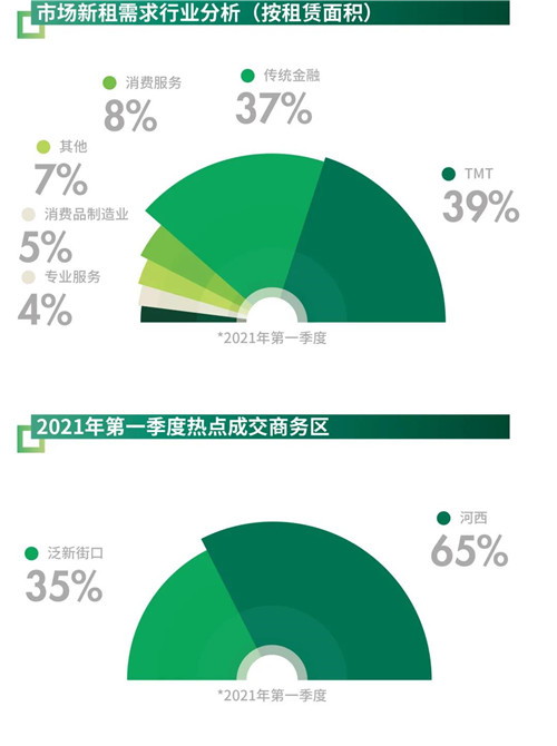 本季度凈吸納量環(huán)比大幅增長至20,879平方米。TMT產(chǎn)業(yè)的租賃成交占到了整體的38.6%,為優(yōu)質(zhì)寫字樓市場最活躍的租戶之一。另外,銀行、證券、信托及基金公司等金融租戶持續(xù)進行布點,租賃交易面積占比達(dá)全市的37.0%。商業(yè)和交通配套持續(xù)升級的河西板塊仍是租戶選址熱點,本季度在全市租賃交易面積中的占比達(dá)到64.9%。