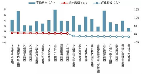 2021年一季度,寫字樓市場加速分化,硬件設(shè)施較好、價(jià)格相對較低的新興商圈持續(xù)吸收周邊外溢需求,部分樓齡相對較長的次核心商圈寫字樓市場恢復(fù)較慢;同時(shí),受制于世界經(jīng)濟(jì)形勢的不確定性,部分外資企業(yè)較多的商圈寫字樓需求亦有所減弱。在寫字樓租金環(huán)比下跌的商圈中,天津華苑商圈跌幅最大,為1.51%;天津小白樓、南京奧體等9個(gè)商圈跌幅亦在1.0%以上;杭州錢江世紀(jì)城、廣州北京路、天津友誼路等23個(gè)商圈跌幅在1.0%以內(nèi)。