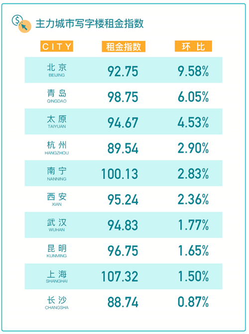 寫字樓租金指數(shù)環(huán)比漲1.19%,租賃找房活躍度指數(shù)環(huán)比上漲13.5%
