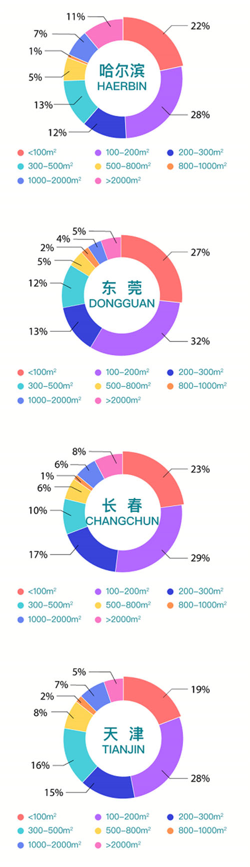 58安居客房產(chǎn)研究院還對(duì)用戶找房面積偏好進(jìn)行了分析,哈爾濱選擇100-200㎡的辦公空間占比最多為28%,選擇小于100㎡的用戶占比為22%;東莞選擇100-200㎡的辦公空間的用戶為32%,高于選擇100㎡以下的用戶;同樣長(zhǎng)春選擇100-200㎡辦公空間的用戶要高于100㎡以下的用戶;天津選擇小于100㎡的用戶占比為19%,選擇100-200㎡辦公空間的用戶占比為28%?傮w來(lái)看,哈爾濱、東莞、長(zhǎng)春和天津整體最受用戶關(guān)注的是100㎡以下及100-200㎡的辦公空間,可見(jiàn)小區(qū)域辦公空間仍為當(dāng)下主流。