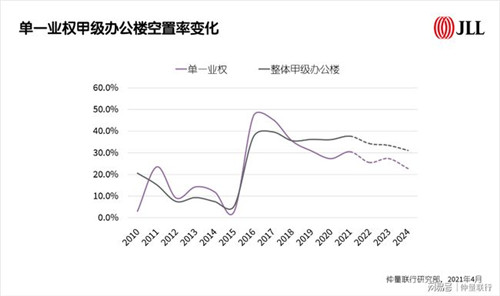 分散業(yè)權的甲級辦公樓空置率仍高達46.9%,除了在售項目的銷售進度影響外,小業(yè)主持有的房源由于缺乏統(tǒng)一運營難以滿足市場重點企業(yè)客戶,而小面積段需求的中小企業(yè)客戶在市場中有更多的選擇,不限于優(yōu)質辦公樓、產業(yè)辦公樓、第三方辦公運營空間或企業(yè)孵化器等。