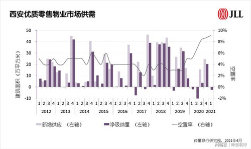 2021年第一季度,西安辦公樓市場進一步復蘇的信號明顯。新增供應的短缺,讓西安甲級辦公樓市場空置率連續(xù)三個季度下滑,收至34.9%;市場訪問量和業(yè)主帶看量的顯著提升,有效提振了業(yè)主方對年內市場的信心,租金降幅收窄至0.3%,至季末報98.5元/平方米/月。零售市場保持平穩(wěn)發(fā)展,春節(jié)期間消費呈現(xiàn)恢復性增長。消費市場已全面復蘇,季內市場未錄得新項目入市,全市總存量保持全國第六。物流地產市場高標庫租賃需求延續(xù)去年下半年的活躍勢頭,傳統(tǒng)電商、快遞快運、專業(yè)市場繼續(xù)成為本季高標庫主力客戶。
