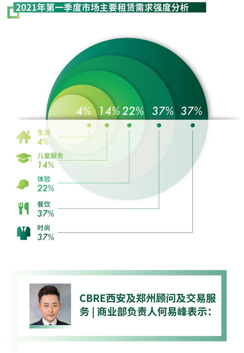 本季度整體甲級(jí)寫字樓市場(chǎng)一改往常第一季度的平靜,表現(xiàn)較為活躍。分需求行業(yè)來(lái)看,TMT、房地產(chǎn)及建筑業(yè)和金融業(yè)的占比繼續(xù)增長(zhǎng),分別占新增租賃需求的21%,17.4%,14.4%。2020年西安研發(fā)投入強(qiáng)度5.17%,技術(shù)市場(chǎng)合同成交額累計(jì)達(dá)到5,600億元,均位居全國(guó)副省級(jí)城市第一。硬科技在為西安現(xiàn)代產(chǎn)業(yè)發(fā)展提供硬支撐的同時(shí)亦推動(dòng)TMT企業(yè)成為寫字樓核心需求來(lái)源。與此同時(shí),隨著甲級(jí)寫字樓中在線教育類租戶的飽和,部分業(yè)主對(duì)于在線教育類勞動(dòng)密集型企業(yè)采取謹(jǐn)慎態(tài)度,加之租金預(yù)期的轉(zhuǎn)變,導(dǎo)致上年度對(duì)甲級(jí)寫字樓需求強(qiáng)勁的在線教育品牌轉(zhuǎn)向產(chǎn)業(yè)園市場(chǎng)。