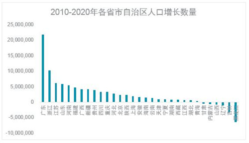 在過去十年中,中國的人口呈現(xiàn)逐漸向東部聚集的趨勢。從人口占比來看,東部地區(qū)人口占比較2010年上升了2.15個百分點,至39.93%。而東北區(qū)域的人口較十年前下降了1.2個百分點。