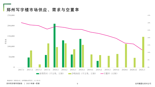2021年第一季度,鄭州寫(xiě)字樓市場(chǎng)無(wú)新增供應(yīng)入市,個(gè)別原計(jì)劃入市的項(xiàng)目均推遲到今年年中交付。