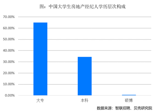 在學(xué)歷方面,全國(guó)大學(xué)生房地產(chǎn)經(jīng)紀(jì)人學(xué)歷構(gòu)成以大專(zhuān)生為主,本科生比例逐年提高,其中不乏重點(diǎn)院校的畢業(yè)生。調(diào)查顯示,65.01%的大學(xué)生經(jīng)紀(jì)人人具有大專(zhuān)學(xué)歷,本科學(xué)歷的占比為34.39%,碩博學(xué)歷占比為0.6%。不同城市間的大學(xué)生經(jīng)紀(jì)人學(xué)歷構(gòu)成存在差異,北京、上海的大學(xué)生經(jīng)紀(jì)人群體中本科學(xué)歷占比六成以上。