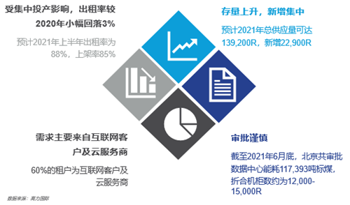 北京作為京津冀數(shù)據(jù)中心市場的核心區(qū)域,市場交易活躍,需求持續(xù)旺盛。經(jīng)統(tǒng)計(jì)分析,北京數(shù)據(jù)中心市場60%左右的租戶為互聯(lián)網(wǎng)客戶及云服務(wù)商。但北京數(shù)據(jù)中心市場監(jiān)管嚴(yán)格,項(xiàng)目審批謹(jǐn)慎,2021年上半年北京共審批數(shù)據(jù)中心能耗117,393噸標(biāo)煤,折合機(jī)柜數(shù)約為12,000-15,000R。