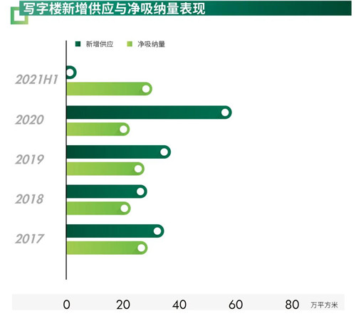 2021年上半年,杭州優(yōu)質寫字樓市場共錄得一處新增供應項目—萬通時尚公館,位于未來科技城板塊,總體量約3.8萬平方米。上半年凈吸納量累計為30.5萬平方米,空置率較2020年末整體下降3個百分點至17.4%,杭州寫字樓市場整體發(fā)展態(tài)勢呈穩(wěn)中向好。