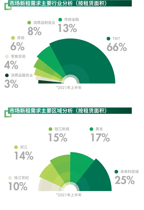 從各子板塊來看,未來科技城、黃龍、錢江新城、濱江是為推動寫字樓市場去化的主力。其中高科技企業(yè)聚集的黃龍板塊高品質樓宇供不應求,租金持續(xù)上升至每月每平方米168.2元,目前僅次于市中心的武林板塊。此外,得益于優(yōu)良的TMT產業(yè)聚集氛圍及政策紅利優(yōu)勢,作為新興市場代表—未來科技城板塊租賃成交活動同樣活躍,上半年凈吸納量共計近5萬平方米。從租戶行業(yè)分析,TMT(65.5%)及傳統(tǒng)金融(13.1%)為上半年兩大主力需求。TMT行業(yè)作為全市租賃市場成交核心主力,如字節(jié)跳動、快手、涂鴉科技、小店科技等多元化的綜合信息技術企業(yè)都有逾萬平方米的大體量成交發(fā)生。此外,傳統(tǒng)金融行業(yè)在核心區(qū)位如武林、錢江新城等板塊也表現活躍,尤以證券、基金類公司為主。