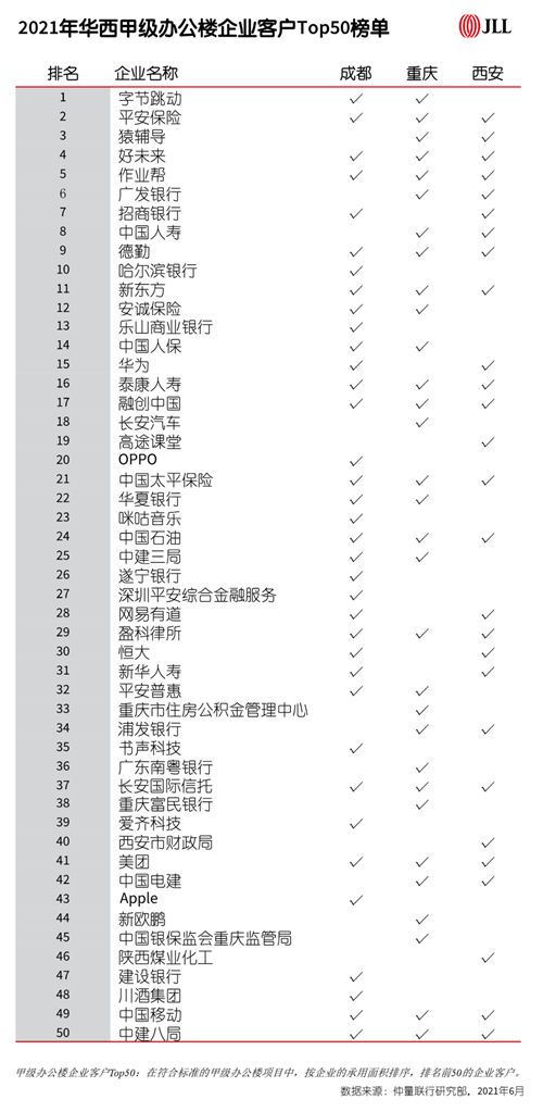 基于對西部辦公樓市場逾十年的數(shù)據(jù)追蹤,仲量聯(lián)行已連續(xù)多年以城市維度發(fā)布Top50系列報(bào)告。本次報(bào)告系仲量聯(lián)行首次以區(qū)域維度,對華西甲級辦公樓中的企業(yè)客戶Top50進(jìn)行排行統(tǒng)計(jì)。