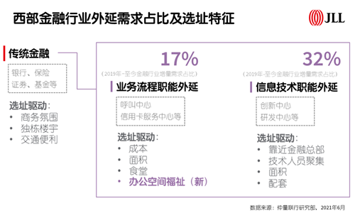 近年來越來越多的金融產(chǎn)業(yè)加速進(jìn)軍內(nèi)陸市場。從早年的呼叫中心、客服中心到今日西部多地的創(chuàng)新中心、研發(fā)中心等多元后臺職能部門,金融企業(yè)對辦公空間的要求及布局愈加具象與多元。2019年至今,西部共錄得該類新增優(yōu)質(zhì)辦公需求近10萬平方米。而隨著金融行業(yè)不同的職能外延,不同類型金融企業(yè)在選址時(shí)的差異化特征亦不斷顯現(xiàn)。