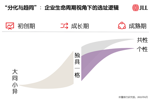 除細(xì)分領(lǐng)域差異外,科技互聯(lián)網(wǎng)企業(yè)在企業(yè)生命周期的不同階段也有不一樣的選址特征。