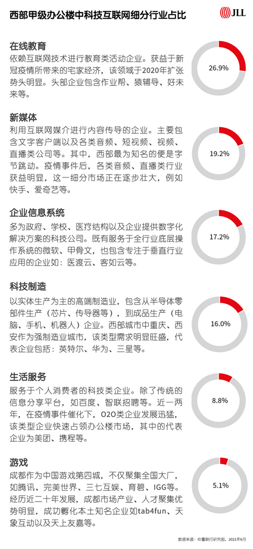 值得關(guān)注的是,由于產(chǎn)品服務(wù)高速迭代,市場玩家結(jié)構(gòu)頻繁發(fā)生變化。對辦公樓租賃市場而言,互聯(lián)網(wǎng)科技行業(yè)的多元性和復(fù)雜性遠(yuǎn)高于其他,僅從單一整體維度進(jìn)行畫像已無法滿足當(dāng)前市場情況。本次報(bào)告中,仲量聯(lián)行創(chuàng)新地將科技互聯(lián)網(wǎng)企業(yè)進(jìn)行了細(xì)分,并計(jì)算出華西甲級辦公樓中科技互聯(lián)網(wǎng)六大細(xì)分領(lǐng)域的租賃面積占比——在線教育(26.9%)、新媒體(19.2%)、企業(yè)信息系統(tǒng)(17.2%)、科技制造(16.0%)、生活服務(wù)(8.8%)以及游戲(5.1%)。