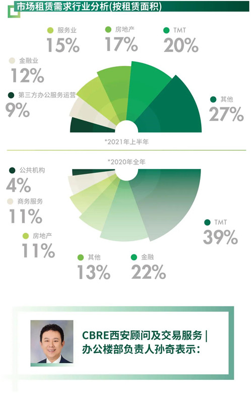 2021年上半年西安寫字樓市場未錄得新入市項(xiàng)目,市場總量仍維持在近623萬平方米。其中甲級寫字樓體量為近163萬。市場需求仍保持活躍,上半年甲級寫字樓凈吸納量約5.7萬平方米,較去年同期增加近55%。市場需求延續(xù)上季度增長態(tài)勢,其中TMT行業(yè)需求占新租需求的20%,特別是如美團(tuán)等互聯(lián)網(wǎng)平臺公司及國內(nèi)高科技技術(shù)應(yīng)用研發(fā)類公司的升級需求領(lǐng)跑行業(yè)新租需求,在高新二期及市中心板塊均完成多宗大面積升級及擴(kuò)租交易。房地產(chǎn)建筑及服務(wù)業(yè)分別占新租需求的17.4%和15.1%,緊隨其后。在活躍需求的影響下,甲級寫字樓市場空置率較去年底下降2.5個百分點(diǎn)至24.7%;平均賬面租金保持相對穩(wěn)定,環(huán)比微升0.1%至每月每平方米102.9元。