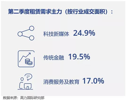 從行業(yè)角度來看,科技新媒體、傳統(tǒng)金融及消費服務(wù)為驅(qū)動辦公存量去化的前三大需求主力。 此外,國內(nèi)外制造業(yè)的需求也有所回暖。