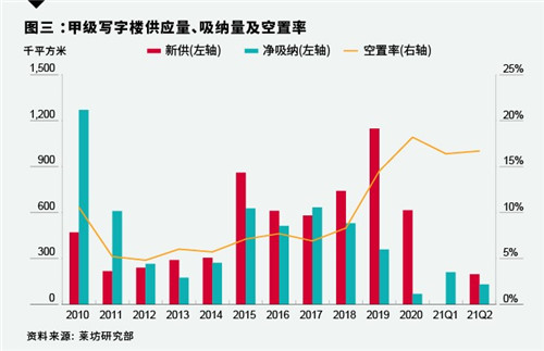 7月20日,萊坊發(fā)布2021年二季度北京甲級寫字樓市場報告指出,第二季度,北京甲級寫字樓市場平均租金環(huán)比下降0.5%至每月每平方米人民幣324.9元,租金降幅進(jìn)一步收窄。全市新增甲級寫字樓面積196,160平方米,推升全市平均空置率環(huán)比上升0.3個百分點至16.7%。在新增供應(yīng)的加持下市場凈吸納量仍達(dá)到近13萬平方米。大宗交易市場上,外資持續(xù)加碼北京商辦房地產(chǎn)市場,寫字樓市場大宗交易表現(xiàn)活躍。