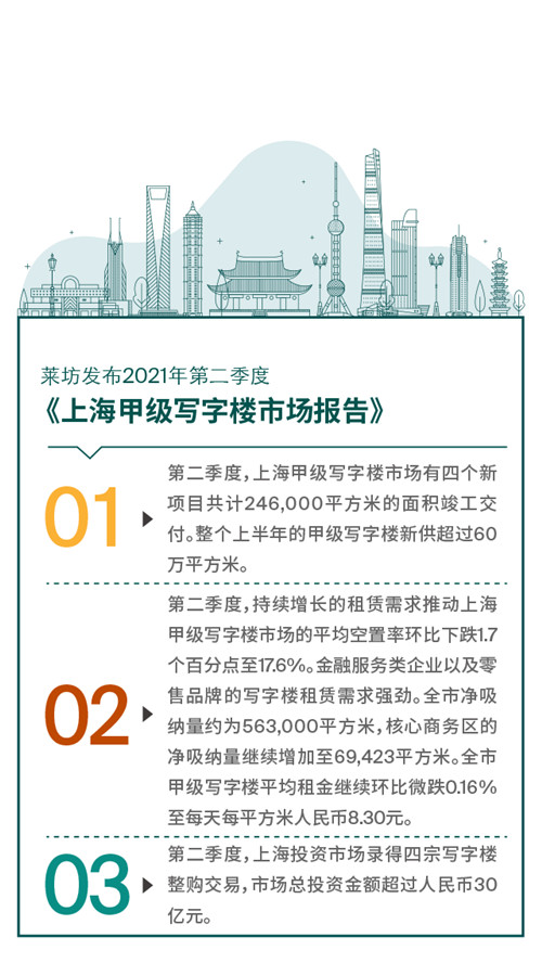 我們預(yù)計2021年下半年上海的甲級寫字樓市場將更為活躍,市場將有不少于100萬平方米的寫字樓新項目入市,新項目主要集中在前灘及徐匯濱江區(qū)域。第三季度,隨著國內(nèi)經(jīng)濟的持續(xù)向好,租賃需求將進一步得到釋放。在租賃雙方均趨于活躍的情況下,市場租金有望止跌回升,而市場空置率將繼續(xù)下降。