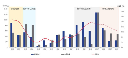 2022年開始,市場(chǎng)進(jìn)入去化周期,空置面積將逐步被市場(chǎng)消化