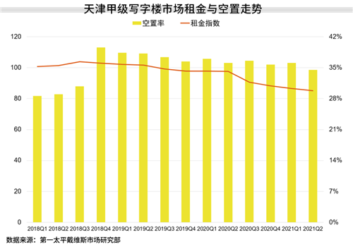 上半年,天津甲級寫字樓市場新增供應入市趨緩,市場以消化現(xiàn)有空置面積為主,租賃市場整體去化較好,空置率同比下降1.6個百分點至34.5%,為近幾年的最低點。