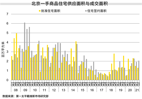 2021年二季度,一手商品住宅市場(chǎng)新增供應(yīng)面積達(dá)130.7萬(wàn)平方米,環(huán)比下降13%;同期,一手商品住宅成交面積為206萬(wàn)平方米,環(huán)比微漲6.4%。二季度另一個(gè)重大變革來(lái)自于供給端的土地市場(chǎng),北京自二季度起開始實(shí)施土地“兩集中”供地規(guī)則,供給端的變革極有可能成為未來(lái)房地產(chǎn)市場(chǎng)發(fā)展的變數(shù),但最終目的仍是保障房地產(chǎn)市場(chǎng)整體平穩(wěn)健康發(fā)展。