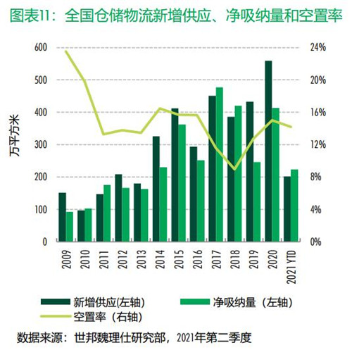 本季16個主要城市總計凈吸納量達到116萬平方米,在強勁需求的推動下,高標倉整體空置率環(huán)比下降0.2個百分點至14.2%,為新冠疫情以來新低。