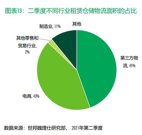 第三方物流和電商仍是最主要的租賃需求來源,分別占二季度整體租賃需求的45%和43%。京東、唯品會等傳統(tǒng)電商新租和擴租面積較大,部分需求與618購物節(jié)備貨有關(guān)。多多買菜等社區(qū)生美團優(yōu)選等社區(qū)團購繼續(xù)布點,本季于環(huán)京、大灣區(qū)、成渝等多個主要城市群內(nèi)均錄得大面積租賃交易。