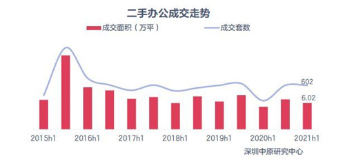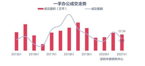 據(jù)深圳中原研究中心數(shù)據(jù),2021上半年寫字樓銷售逐漸恢復(fù)增長(zhǎng),一手辦公成交面積 22.54萬(wàn)平方米,同比上升 20.03%。寶安區(qū)成交面積最大,占全市一手辦公成交面積32.7%。