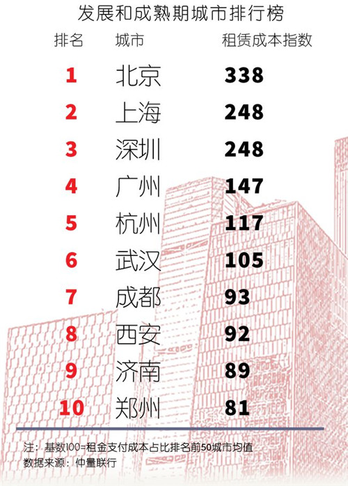 以處于發(fā)展和成熟期前十名的城市為例(如下圖),租賃成本指數(shù)越大,其租金承付能力就越高,市場(chǎng)發(fā)展動(dòng)力就越強(qiáng),體現(xiàn)著中國(guó)樓宇經(jīng)濟(jì)發(fā)展的最高水平,聚集著大量的頭部企業(yè),如北京、上海、成都、西安等。