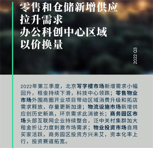 2022年第三季度北京商務(wù)園區(qū)市場未錄得新項目的交付。整體市場新增需求放緩,頭部互聯(lián)網(wǎng)企業(yè)持續(xù)縮減面積,部份中小型互聯(lián)網(wǎng)企業(yè)也陸續(xù)出現(xiàn)到期不續(xù)或面積騰退的現(xiàn)象,季內(nèi)錄得凈吸納量-6.4萬平方米,空置率環(huán)比上漲0.2個百分點至18.1%。人工智能、軟件開發(fā)等TMT行業(yè)、芯片等工業(yè)品制造業(yè)、醫(yī)藥及生命科學行業(yè)新租較為活躍,房地產(chǎn)建筑亦釋放搬遷類需求。區(qū)域市場表現(xiàn)日益分化:上地、中關(guān)村軟件園當前帶看的以5,000平方米以下的跨區(qū)域搬遷類需求為主,但租戶決策進度放緩,使得年內(nèi)騰退的面積難以得到有效去化;電子城、豐臺科技園子市場凈吸納量均錄得負值,除了受到互聯(lián)網(wǎng)、專業(yè)服務(wù)等行業(yè)面積騰退的影響,新租需求觀望情緒明顯;多元化的產(chǎn)業(yè)發(fā)展使得經(jīng)開區(qū)子市場在面對市場諸多不確定性時更具韌性,醫(yī)藥及汽車等產(chǎn)業(yè)數(shù)字化進程催生辦公需求,裝備制造及航空航天行業(yè)亦有成交;而順義子市場季內(nèi)去化則得益于汽車互聯(lián)網(wǎng)相關(guān)類型需求。