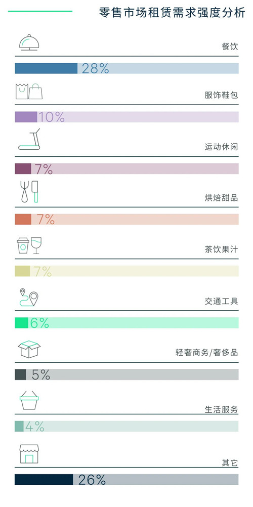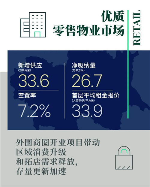 在新增商業(yè)項目開業(yè)帶動下,積蓄已久的開店需求得到一定釋放,凈吸納量為近五個季度的最高水平。但由于多數(shù)現(xiàn)有項目客流量尚未完全恢復,引入新品牌進度仍然較為緩慢。新增需求以粵菜、烤肉、輕食餐吧等類別的餐廳品牌為主,網(wǎng)紅咖啡茶飲品牌則有Manner、%Arabica等較為活躍。零售業(yè)態(tài)中,BAPE、STARTER、李寧、FILA等潮流服飾和運動戶外品牌均有新店開出,而新能源汽車更趨布局在人口密度較大的商務(wù)區(qū)及居住社區(qū),高奢珠寶及香氛(如DR、凱利安、馥馬爾)等高承租能力的品牌亦補位核心商圈此前騰退的鋪位。個別現(xiàn)有項目清退老舊業(yè)態(tài)和品牌,短期內(nèi)出現(xiàn)大面積空置。全市空置率環(huán)比上升0.5個百分點至7.2%。自疫情以來租金持續(xù)走低,但降幅較上季度有所收窄,全市購物中心首層平均租金報價環(huán)比下調(diào)0.8%至每天每平方米33.9元。本輪疫情以來空置漲幅較大的商業(yè)體采取給予短期租金折扣的方式促進去化。成熟商圈租金相對穩(wěn)定,而外圍商圈商戶經(jīng)營相對脆弱,業(yè)主對其租金政策則更加靈活。