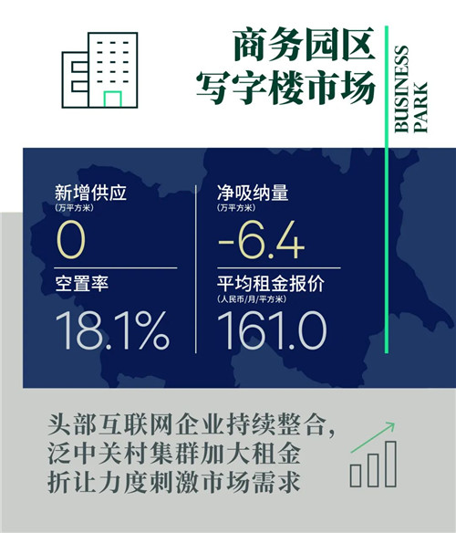 由于包括頭部互聯(lián)網(wǎng)企業(yè)在內(nèi)的部分企業(yè)持續(xù)整合、退租,全市凈吸納量持續(xù)錄得負值,為-1.4萬平方米,大面積退租仍主要集中在中關(guān)村和望京區(qū)域。乙級樓宇退換租現(xiàn)象尤其明顯,季末凈吸納量錄得-6.1萬平方米;而甲級市場保持韌性,凈吸納量環(huán)比上漲至4.7萬平方米。整體市場空置率環(huán)比上升0.4個百分點至18.1%。