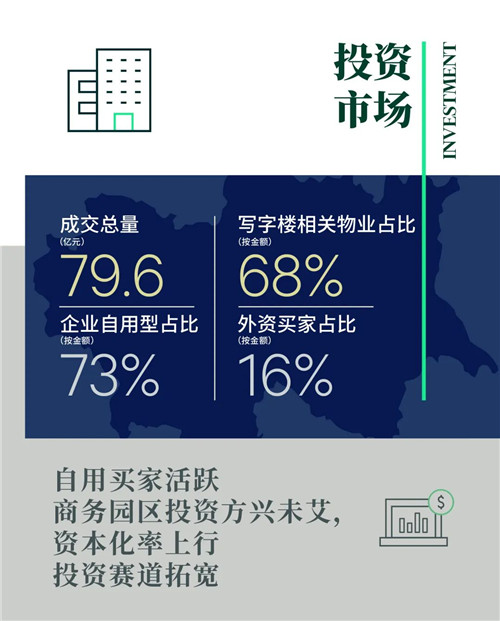 本季度有5筆交易位于外圍的園區(qū),占總交易額的45%,包括季內(nèi)金額最大的交易——國內(nèi)某大型軟件公司購置北清路的智谷大廈,以及某外資制造企業(yè)將其在電子城IT產(chǎn)業(yè)園租用的獨棟辦公收購自用。受益于北京對高精尖產(chǎn)業(yè)集聚能力的不斷提升,以及產(chǎn)業(yè)園REITs上市和擴募火熱進行,投資型買家也對商務(wù)園區(qū)發(fā)展前景寄予厚望,CBC康橋資本購置大興藥谷一號,以及某中資園區(qū)開發(fā)商購入平谷同創(chuàng)汽車產(chǎn)業(yè)園并計劃對物業(yè)進行改造升級,均反映投資者對該板塊的關(guān)注度。