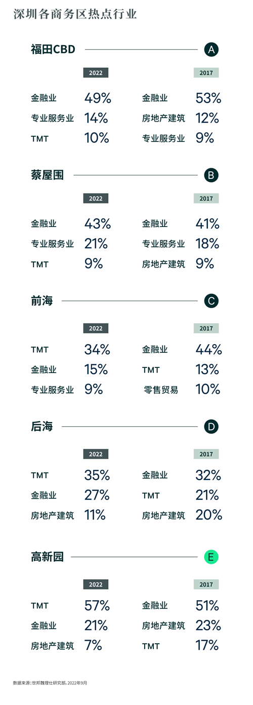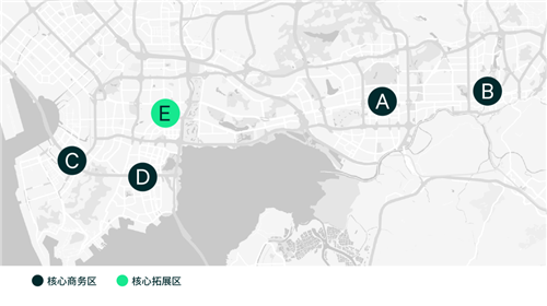 TMT和金融穩(wěn)居深圳主要商務片區(qū)需求榜的前兩席,其中TMT板塊需求增長迅猛,替代5年前部分片區(qū)位居第二位的專業(yè)服務及房地產(chǎn)建筑板塊的需求。TMT在各大商務片區(qū)中的需求比例均有顯著提升,且呈現(xiàn)出對于南山區(qū)明顯的市場偏好,主要原因在于高新園區(qū)、后海片區(qū)作為頭部科技總部所在地,吸引了眾多上下游企業(yè),從而形成了較為完整的科技生態(tài)圈,不斷帶動科技企業(yè)的聚集。而金融行業(yè)需求則橫跨多個商務片區(qū),福田和南山區(qū)均納入選址考慮范圍,從前海、后海和高新園區(qū)來看,金融業(yè)板塊均為第二大需求來源。此外,專業(yè)服務業(yè)和房地產(chǎn)建筑作為第三位需求來源,則因片區(qū)分布而有差異。專業(yè)服務業(yè)需求主要分布在原本占比較高的福田CBD和蔡屋圍兩大片區(qū),以及相應產(chǎn)業(yè)政策引導下的前海片區(qū),其中福田CBD更是聚集了全市近一半的專業(yè)服務業(yè)需求,三大商務片區(qū)中均監(jiān)測到3個百分點以上的需求提升。而房地產(chǎn)建筑需求則主要分布在近年來房地產(chǎn)項目新增供應較多的高新園和后海片區(qū),近項目擇址偏好明顯。但受房地產(chǎn)行業(yè)政策調(diào)控的影響,在兩大商務片區(qū)的需求比例對比5年前均有約10個百分點的減少。