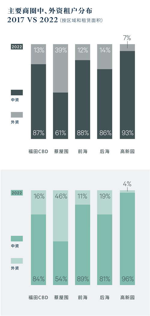 金融和科技板塊需求共同增長推動內(nèi)資企業(yè)需求占比相對2017年提升7個百分點,二者占比約6成左右?萍夹袠I(yè)對內(nèi)資企業(yè)需求貢獻比例增長較為明顯,較2017年增長約15個百分點,包括大面積需求的頭部企業(yè),以及圍繞頭部企業(yè)搭建的科技生態(tài)鏈所吸引的上下游中小型科技企業(yè)也在積極擴張。與此同時,外資企業(yè)的擴張也主要來自于科技行業(yè)的貢獻,從外資企業(yè)需求細分來看,TMT板塊以22%的需求占比位居首位,科技互聯(lián)網(wǎng)子版塊需求占主導地位,吸引了包括三星、IBM和高通等在內(nèi)的知名企業(yè)的進駐。以科技企業(yè)擴張為主的外資企業(yè)需求為主帶動科技屬性最強的高新園片區(qū)的外資企業(yè)需求占比對比5年前提升3個百分點。