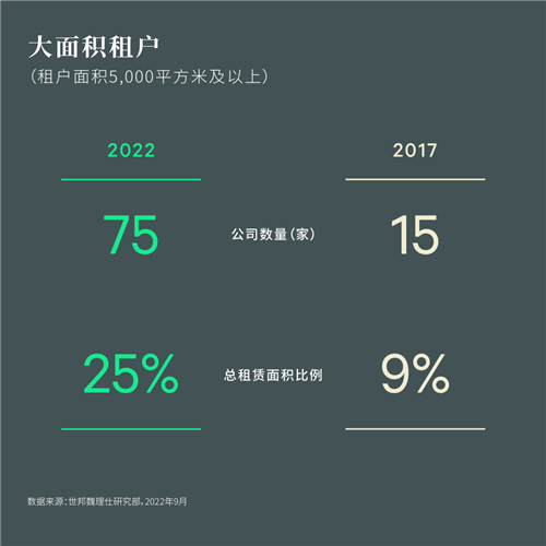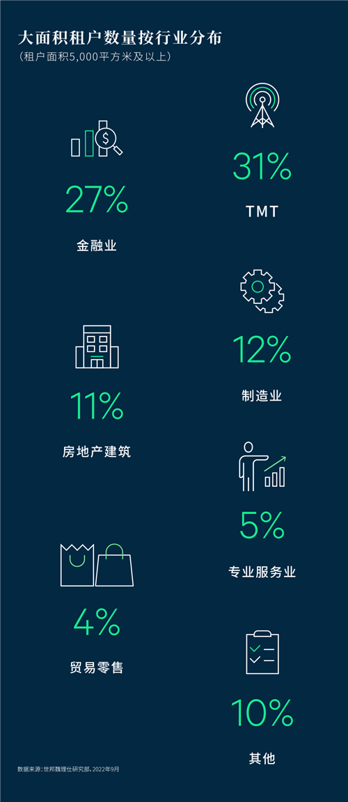 聚焦5,000平方米以上的特大型租戶,對比2017年以銀行、保險和證券為主的金融板塊為主的需求結(jié)構(gòu),受近年來頭部科技企業(yè)的快速擴張帶動,2022年科技板塊需求位列榜首,占比為31%,高于金融板塊4個百分點。