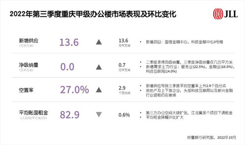 2022年第三季度重慶甲級(jí)辦公樓市場表現(xiàn)及環(huán)比變化