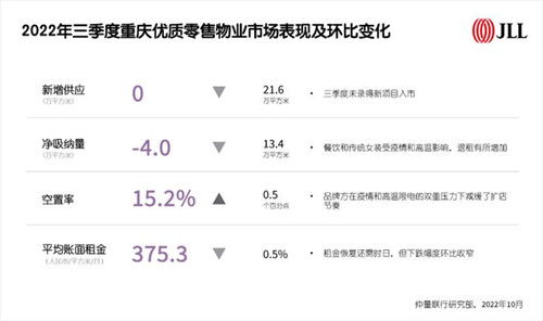 2022年三季度重慶優(yōu)質(zhì)零售物業(yè)市場表現(xiàn)及環(huán)比變化