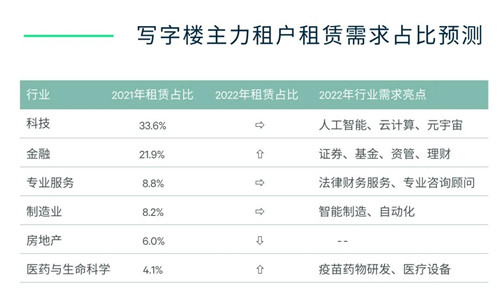 科技和金融仍將是2022年寫字樓的主力需求引擎,我們預(yù)計(jì),兩大行業(yè)在寫字樓租賃成交的貢獻(xiàn)占比將基本保持在2021年的水平。但助推需求的子行業(yè)將有新的亮點(diǎn)出現(xiàn)。
