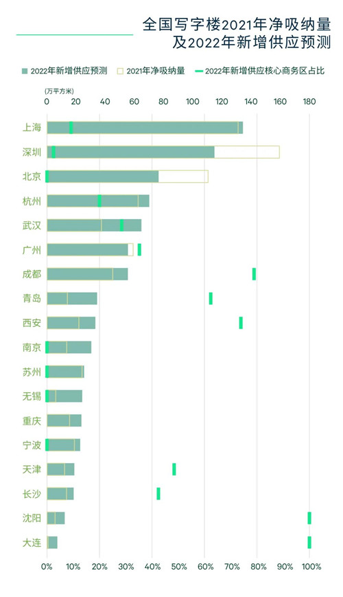 綜合以上因素,CBRE預(yù)計(jì)2022年全國寫字樓凈吸納量將達(dá)到620萬平方米,雖較2021年的峰值回落17%,但顯著高于過去五年530萬平方米的平均水平。