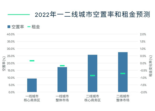 伴隨新增供應(yīng)的反彈,2022年末國內(nèi)18個(gè)主要城市寫字樓市場(chǎng)的整體空置率水平預(yù)計(jì)將回升至23%,但仍低于疫情爆發(fā)的2020年的峰值水平。市場(chǎng)供需整體將利于租戶方,但城市與板塊間的格局將有所分化。