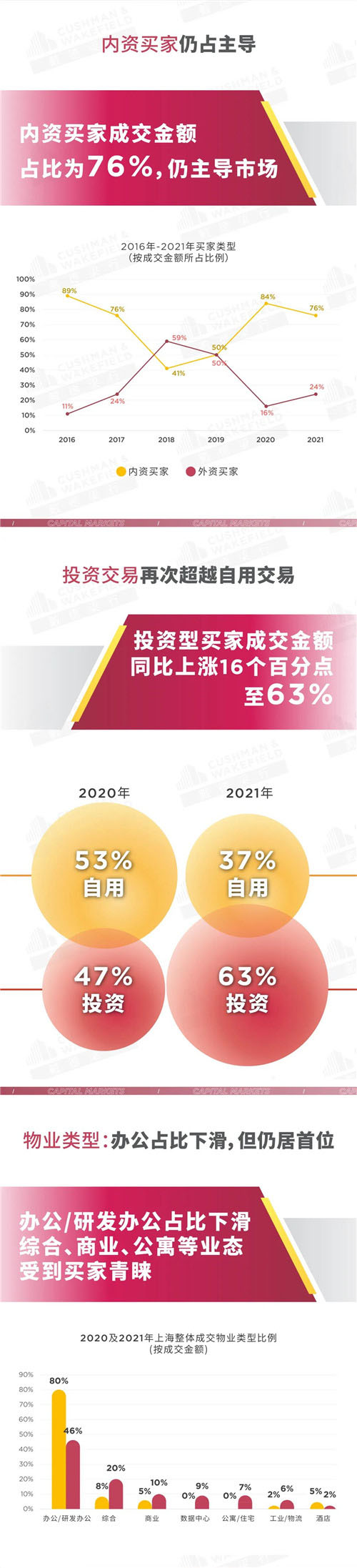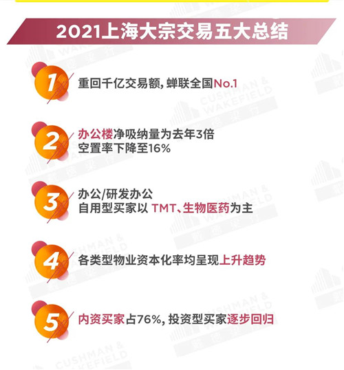 戴德梁行近日對(duì)2021年上海房地產(chǎn)大宗交易市場回顧與展望指出,2021年上海大宗交易額重回千億,蟬聯(lián)全國首位。其中內(nèi)資買家占76%,投資型買家逐步回歸。從物業(yè)類型看,寫字樓物業(yè)占比下滑至46%,但仍居首位。
