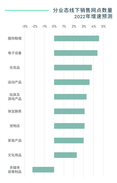 購物中心主力業(yè)態(tài)在2022年仍然具備持續(xù)增長的動能。根據(jù)Euromonitor的預(yù)測,服飾鞋帽作為購物中心零售業(yè)態(tài)主力預(yù)計將實現(xiàn)4.5%左右的門店數(shù)增長。融合消費體驗和銷售的電子設(shè)備產(chǎn)品也將持續(xù)進駐購物中心;瘖y品和運動產(chǎn)品的門店數(shù)將錄得3.5%以上的增長。