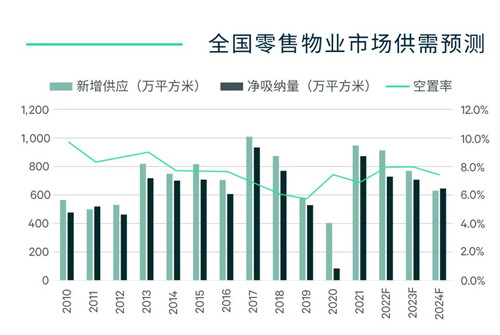 2022年全國購物中心的新增供應(yīng)量預(yù)計與2021年基本持平,總量約900萬平方米。其中,近九成的項目位于非核心商圈,但有近六成的項目由經(jīng)驗開發(fā)商管理運營,我們對整體的招商情況持樂觀預(yù)期。同時,新業(yè)態(tài)、新模式的不斷涌現(xiàn),疊加各地政府積極的協(xié)助招商措施,均有利于業(yè)主去化商場空置面積。故此我們預(yù)計,全國整體空置率將呈現(xiàn)小幅增長,但均值有望保持在10%以下。