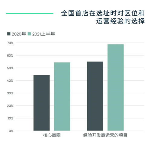 從選址策略上看,品牌對區(qū)位和業(yè)主的運營經(jīng)驗的要求均有所提高,而對運營經(jīng)驗的重視度更為突出。根據(jù)CBRE對可錄得的全國首店選址情況,2021年上半年,有近七成的門店開設(shè)在具備豐富運營經(jīng)驗的業(yè)主的項目內(nèi),較2020年提升15個百分點。與此同時,首店選址于核心商圈的占比從44%提升至54%。