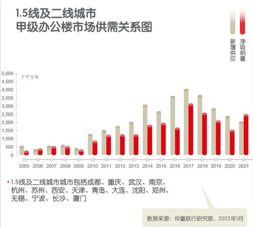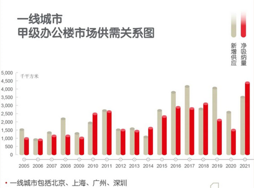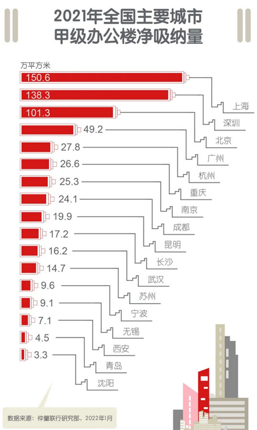 在經(jīng)濟回暖的支持下,2021年成為了中國辦公樓市場有史以來需求增量最為強勁的年份之一,全年多個城市的凈吸納量突破了歷史新高。全年主要城市的凈吸納量達到660萬平方米。