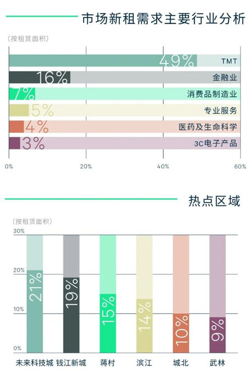 行業(yè)需求方面,正值邁入全面推進數(shù)字經(jīng)濟的開局之年,杭州TMT盡管受下半年監(jiān)管收緊影響動能有所放緩,但仍占據(jù)其寫字樓市場近半需求來源,以阿里系電商、在線文娛和推動企業(yè)數(shù)字化轉(zhuǎn)型相關(guān)軟件開發(fā)等細分領(lǐng)域表現(xiàn)最為堅挺,在頭部企業(yè)集聚的未來科技城、蔣村和濱江子市場積極擴租布局;其次,基金、銀行、證券、保險為主的金融需求持續(xù),以營業(yè)和業(yè)務(wù)拓展部門為主集聚錢江新城等核心商務(wù)區(qū);此外,律所為主的專業(yè)服務(wù)擴租提速,而互聯(lián)網(wǎng)+相關(guān)消費制造業(yè),專精特新相關(guān)的新能源汽車與大健康醫(yī)藥等細分賽道增長顯著,其中不乏外資首入市場,使得內(nèi)資驅(qū)動的杭州寫字樓全年外資占比較前兩年分別擴大2%和6%。除受政策驅(qū)動擴張的頭部TMT和戰(zhàn)略高科技產(chǎn)業(yè)陸續(xù)錄得大面積市場租賃外,2千平方米內(nèi)的成交面積段仍是市場主流。