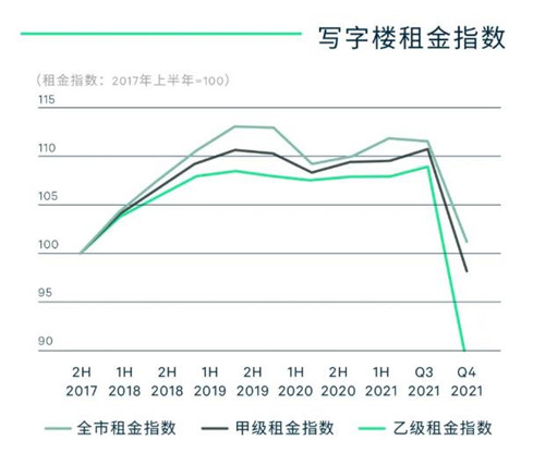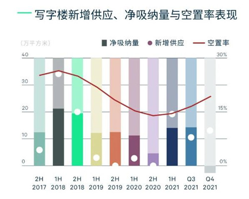 租賃市場(chǎng)穩(wěn)步發(fā)展,客戶方市場(chǎng)特征嶄露頭角。房地產(chǎn)“三道紅線”政策下,鄭州房地產(chǎn)租賃市場(chǎng)出現(xiàn)大面積退租及減租表現(xiàn),“雙減”政策下,在線教培行業(yè)業(yè)務(wù)收縮,波及第四季度全市寫字樓市場(chǎng)凈吸納量呈現(xiàn)負(fù)增長(zhǎng)趨勢(shì)。全市寫字樓凈吸納量錄得負(fù)2.6萬(wàn)平方米。市場(chǎng)活躍度降低,去化率減弱,凈吸納量出現(xiàn)負(fù)增長(zhǎng),CBRE預(yù)判2022年市場(chǎng)將逐步進(jìn)入客戶方市場(chǎng)。