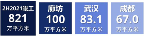 2021年下半年竣工面積最大的城市為廊坊,達100萬平方米。有5個城市的半年新增供應(yīng)超過50萬平方米:廊坊、武漢、成都、西安和嘉興。