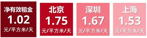 市場平均租金為人民幣1.02元/平方米/天。北京、深圳和上海的凈有效租金依舊保持前三,顯著高于其他城市。