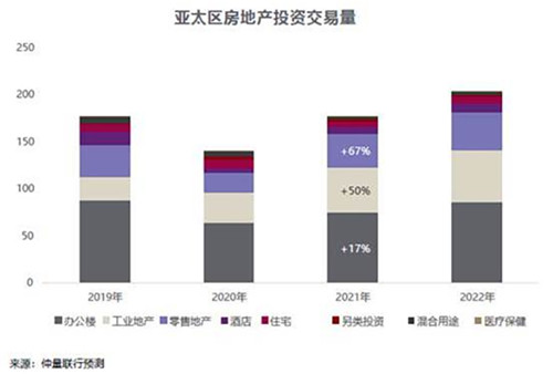 零售地產(chǎn)方面,亞太區(qū)消費的復蘇及良好的收益使投資者重拾對零售資產(chǎn)的投資信心,2021年資產(chǎn)交易大幅反彈67%,交易金額達360億美元。